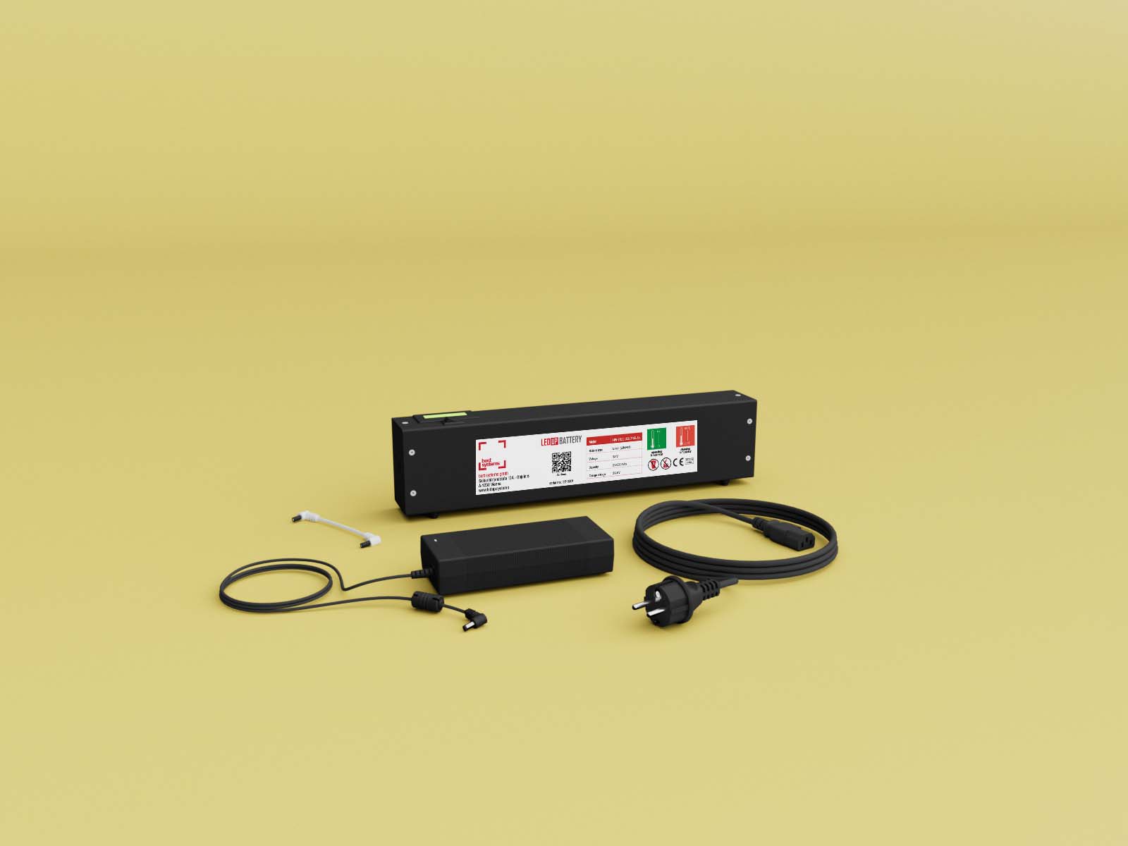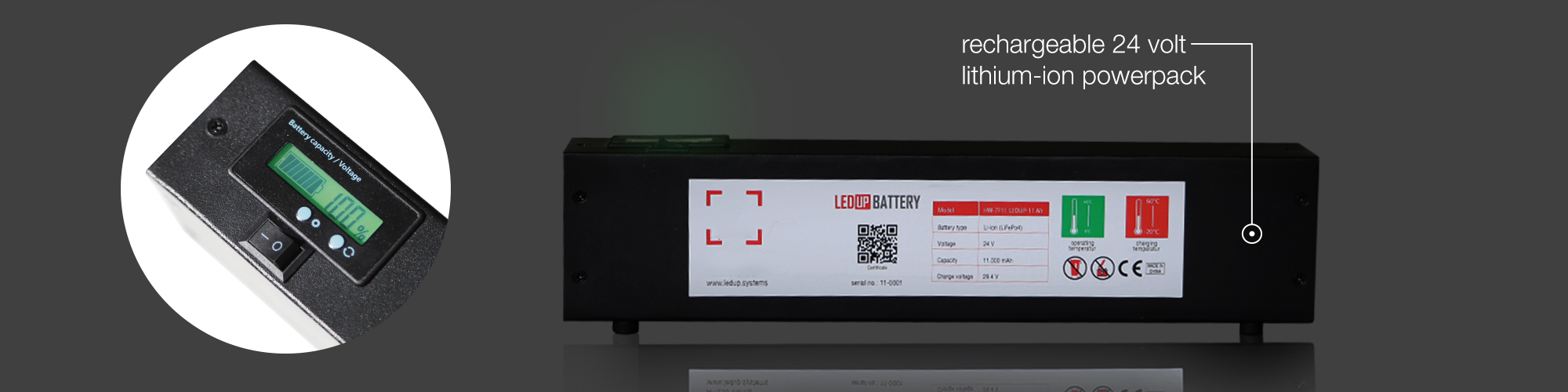 Der wiederaufladbare 24 Volt Lithium-Ionen-Akku hat ein Gewicht von 2,8 kg bei einer Leistung von 11.000mAh und kann z.B. den Counter MAX ca. 9 Stunden lang beleuchten. Damit haben Sie die Möglichkeit, einen Counter, einen ganzen Messetag lang zu beleuchten.