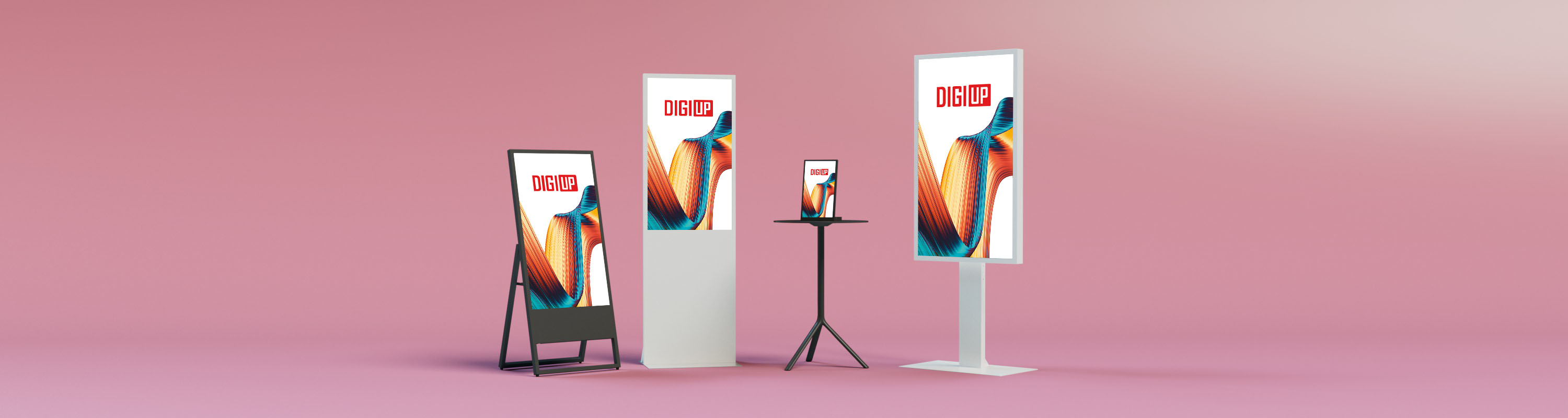 Der DIGIUP STAND ist ein digitaler Kundenstopper mit Full HD LCD Display und integriertem Media Player. Das Display spielt Videos, Animationen, Bilder und bei Bedarf auch Ton in einem kontinuierlichen Loop ab.
