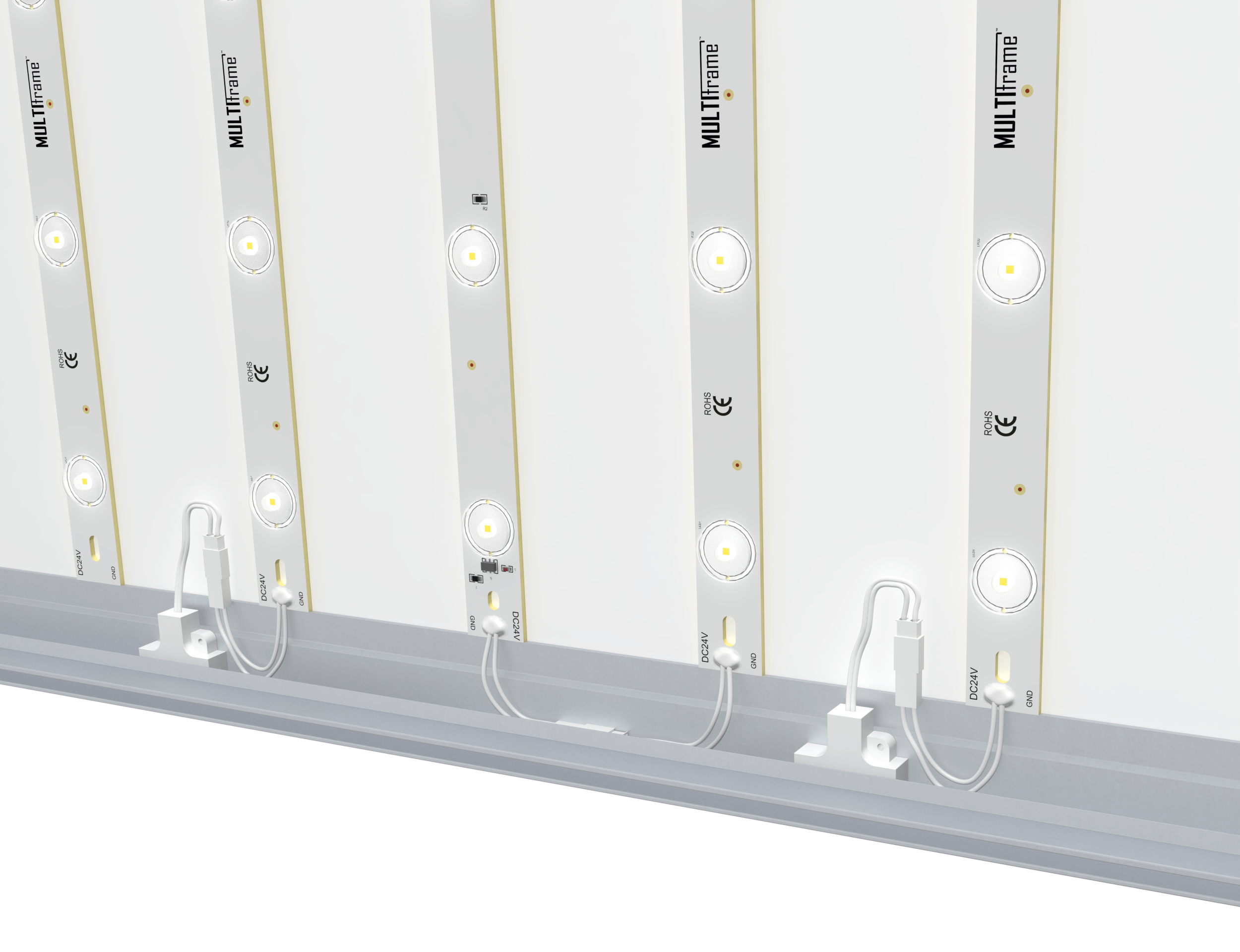 Unsere LED-Module sind mit einem speziellen Kabelsystem ausgestattet, das in den Schlitzen des Aluminiumprofils im Rahmen versteckt werden kann, um eine schattenfreie Ausleuchtung zu gewährleisten.