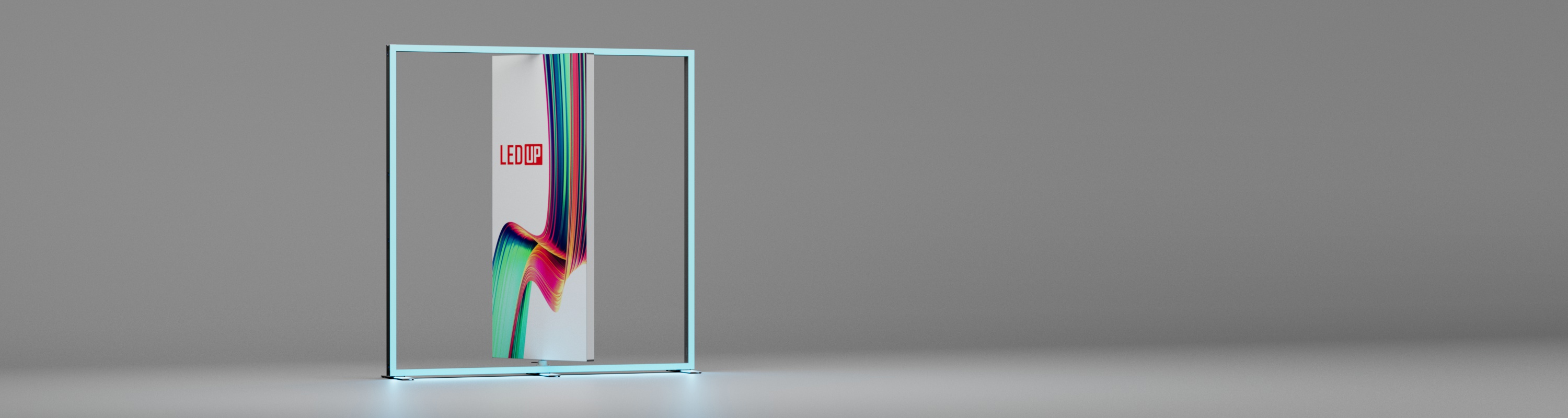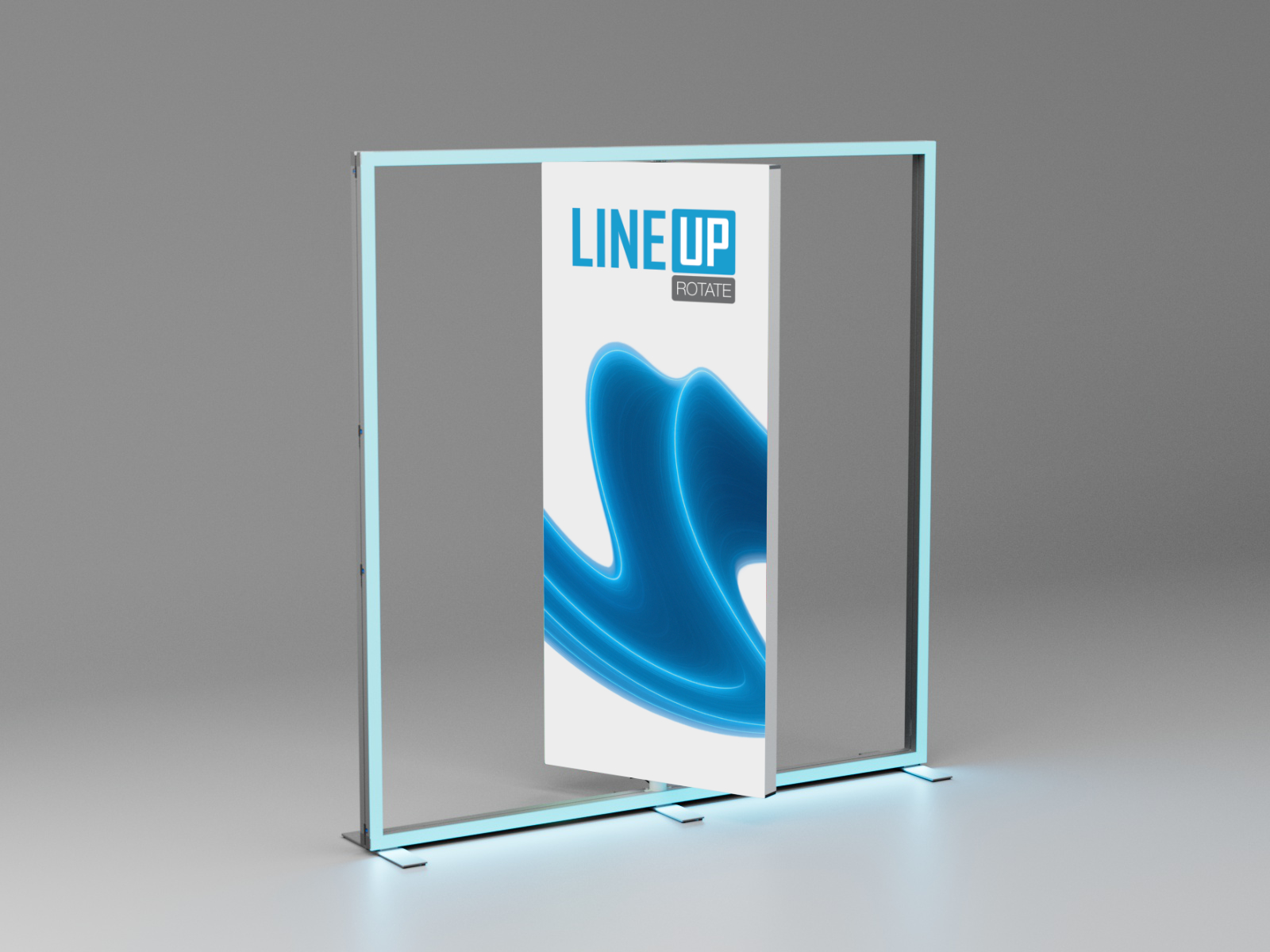 LINEUP rotate ist die neue, drehbare Erweiterung für das LINEUP system und sorgt für Bewegung und doppelte Aufmerksamkeit bei Events und Präsentationen. Das beleuchtete Rotationsmodul misst immer 100 cm in der Breite und ist beidseitig mit Stoff bespannbar – perfekt für wechselnde Werbebotschaften oder doppelseitige Designs. Die Höhe des rotate systems passt sich der Gesamthöhe des LINEUP systems an: