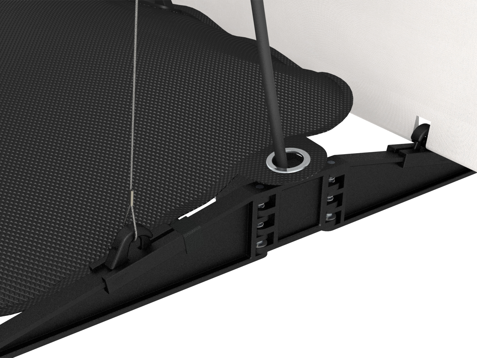 Die selbst-arretierenden Fußteile werden aufgeklappt. Die Struktur aus steckbaren Glasfaserstäben und Aluminiumverbindern wird zusammengesteckt. Die Stahlseile werden in den Haken eingehängt und arretiert. Das Paneel einhängen, die zwei Stützprofile auf den Fußteil legen und den Wassersack darüber legen – fertig ist das Display.