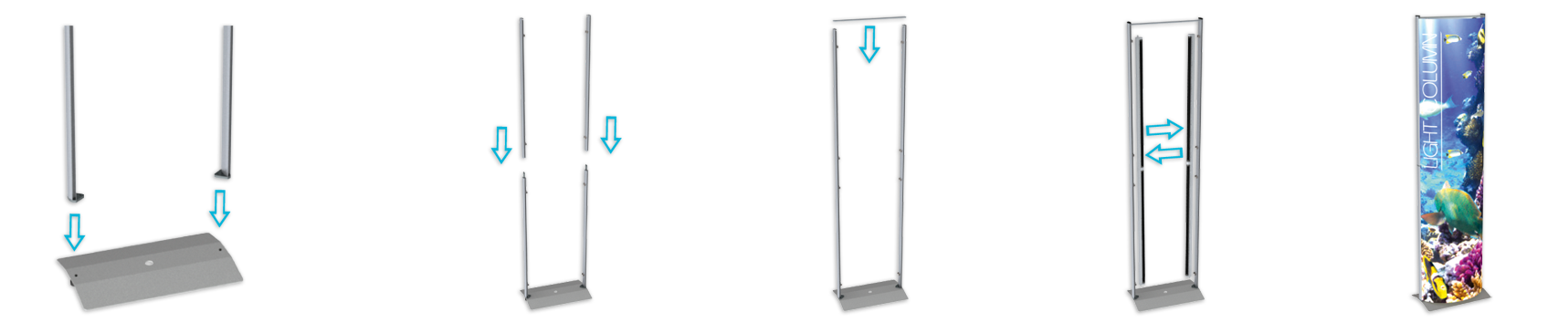 Die tragbare Lightcolumn besteht aus einer Basis, zwei zweiteiligen Stangen, einer oberen Verbindung, vier Lampen und zwei Grafikpaneelen.