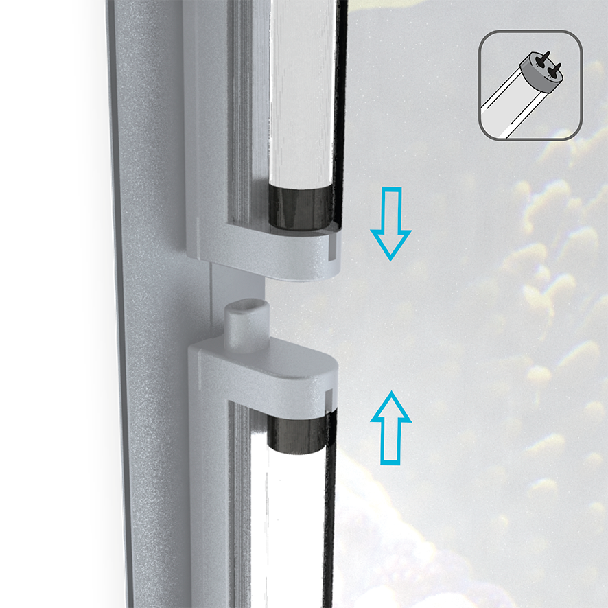 Vier Lampen, ein Kabel und ein Stecker sind im Lieferumfang enthalten. Stecken Sie die Lampen zusammen und befestigen Sie sie an den Seitenprofilen. Die Lampen beleuchten nun beide Paneele gleichmäßig.